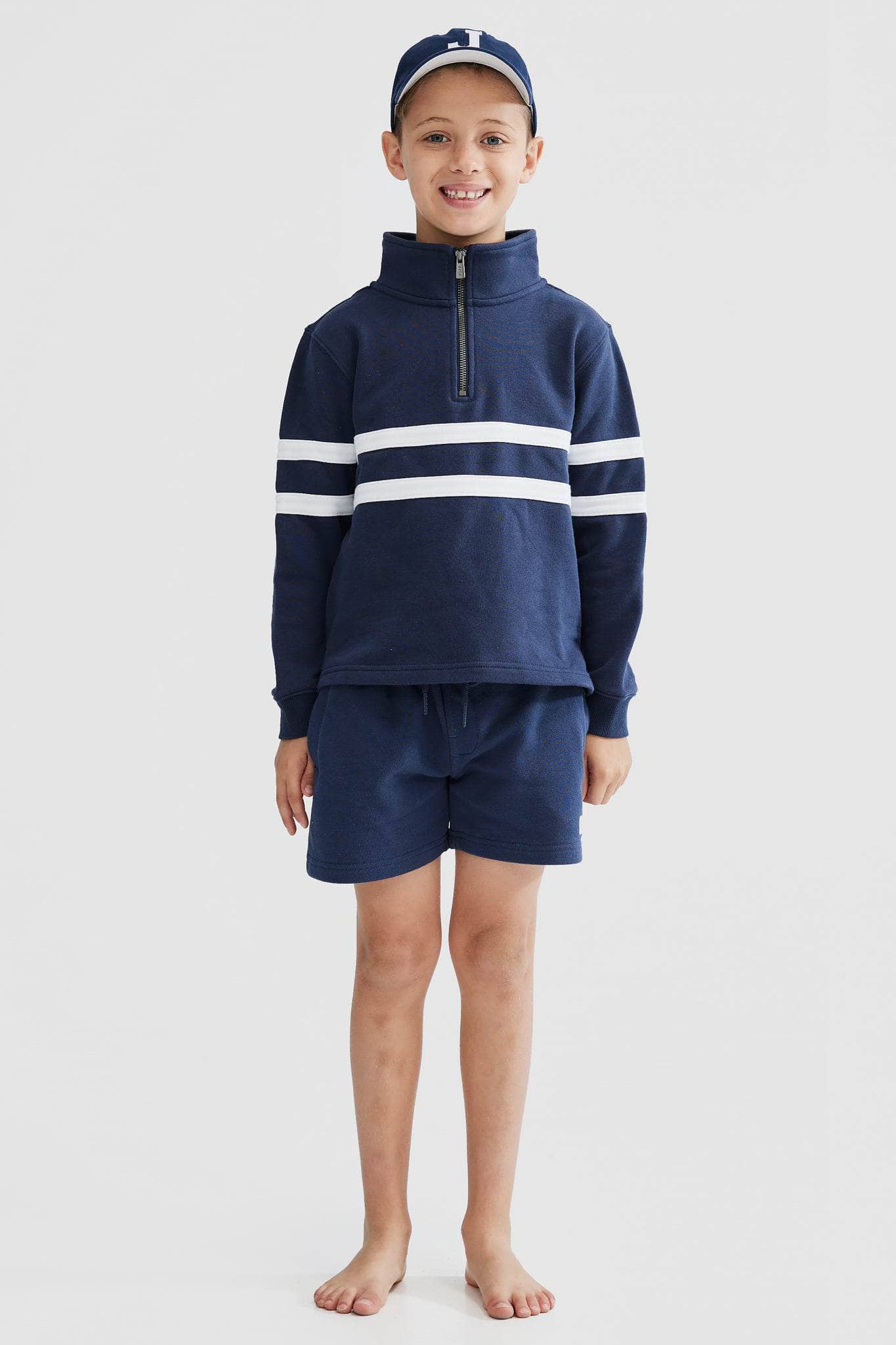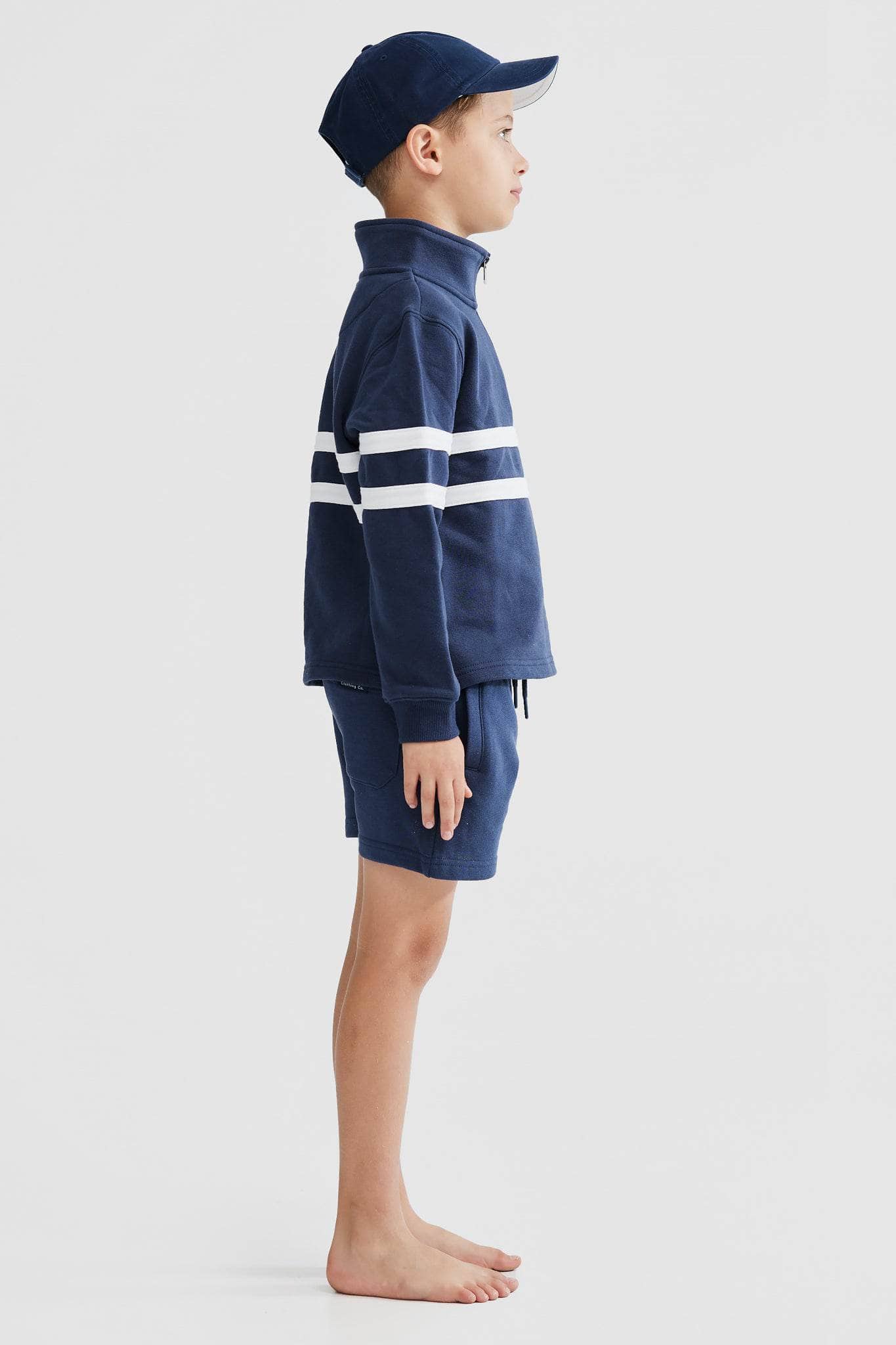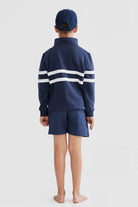 The classic Collegiate Stripe Quarter Zip Navy is now available in Junior sizes! Designed and made with quality in mind, the Collegiate Stripe Quarter Zips are crafted from 100% Cotton french terry and feature striped panels, ribbed cuffs and a split hemline, finished with a brass-coloured zipper.