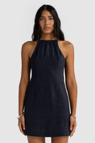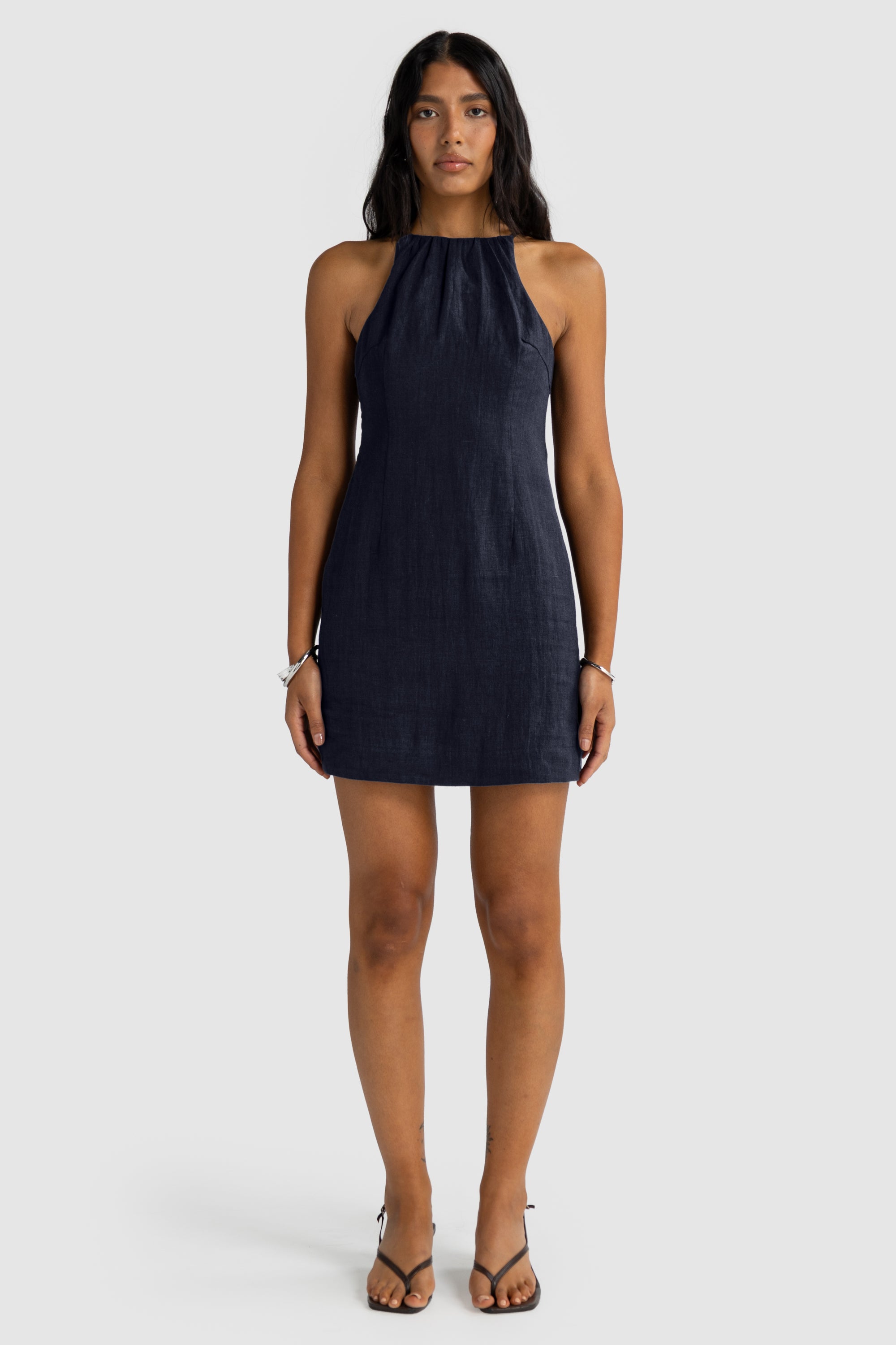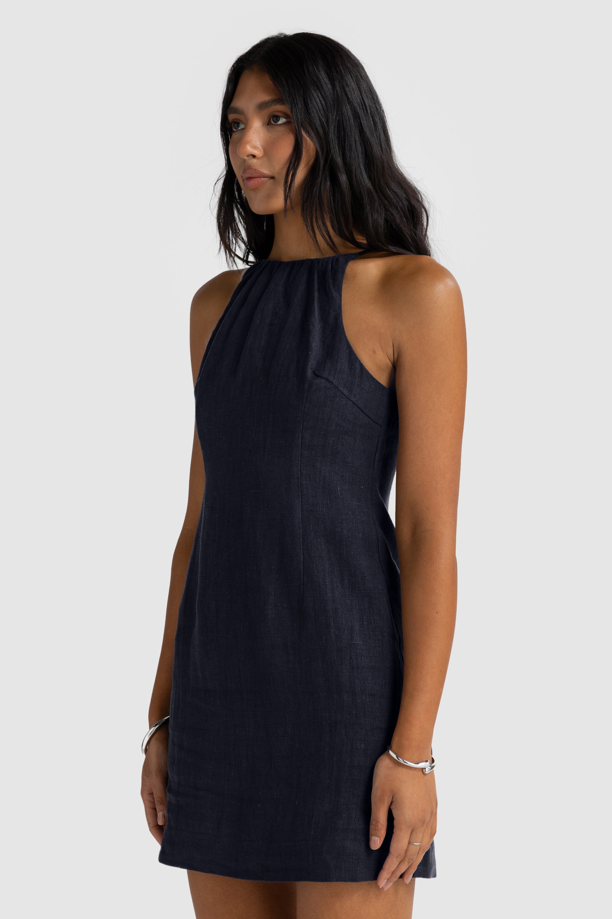 Effortless and elegant, the Jessie Linen Gathered Neck Mini is your go-to for easy summer sophistication. Crafted from 100% linen, it features a softly gathered neckline that flatters the silhouette and ties at the back for an adjustable fit. Subtle front panel stitching adds structure and a tailored finish. Perfect with sandals for a relaxed look or dressed up with heels and statement jewellery.