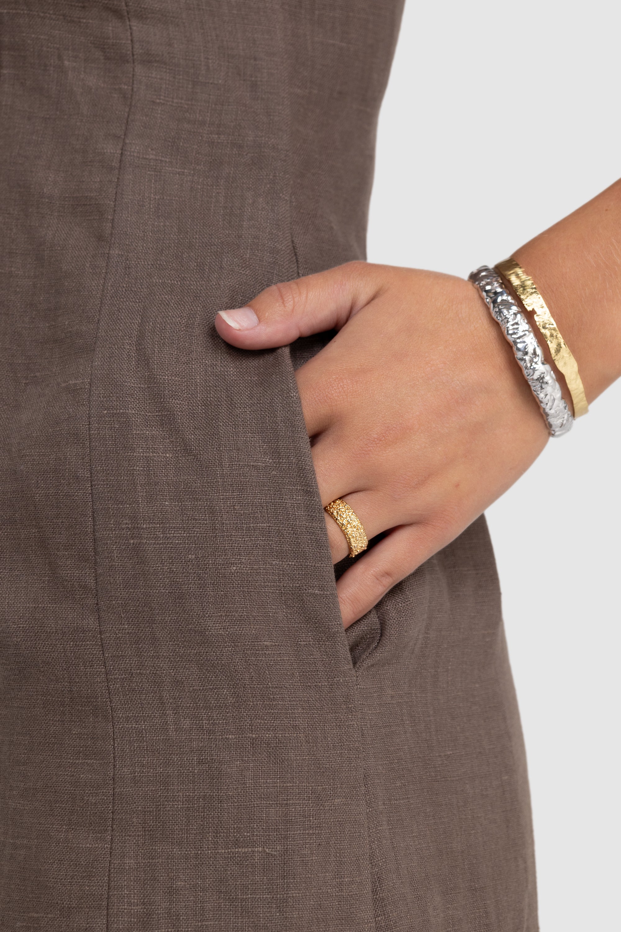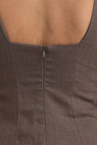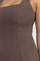 The Zoey Linen Mini Dress Bark is a refined and sophisticated silhouette that showcases a sleek straight neckline adorned with wide straps, perfect for pairing with a bra. A flattering fitted waist and stunning design seams complete the look. This elevated dress is suitable for a multitude of occasions.