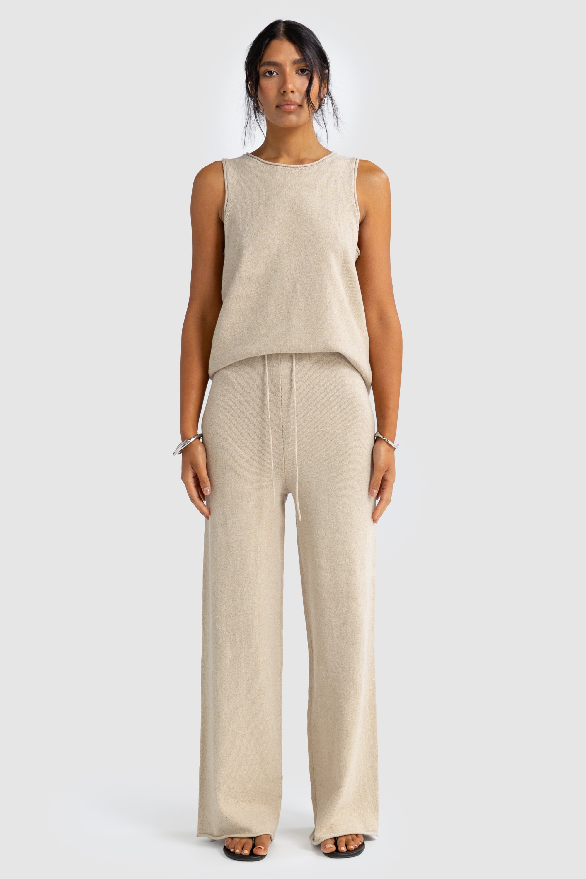 The Holly Knit Pants are the perfect balance of comfort and sophistication. These mid-lightweight knit pants feature a relaxed wide-leg silhouette with an elasticated waistband and adjustable drawstring for an effortless fit. Designed for everyday ease, they move seamlessly from lounging at home to long lunches by the coast.Pair with the matching Holly Knit Top or Long Sleeve Top for a coordinated, elevated lounge look.