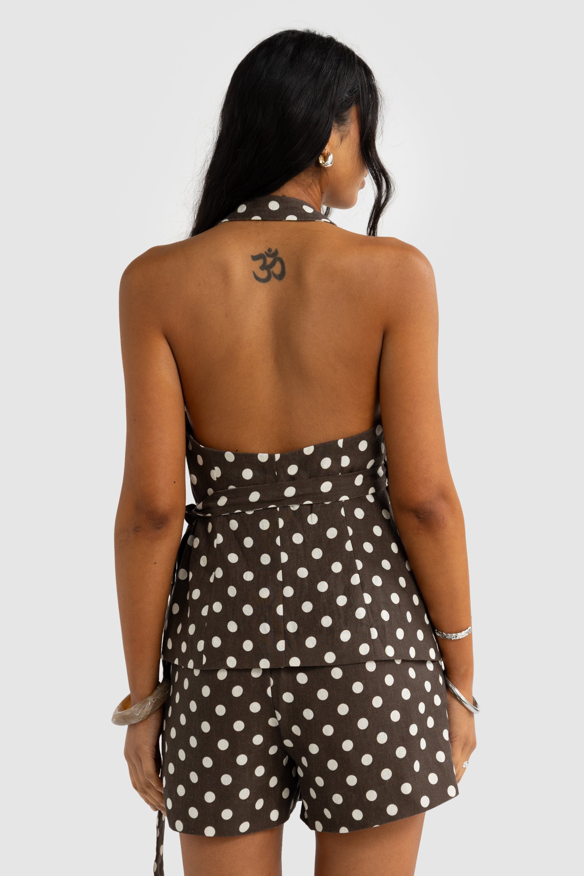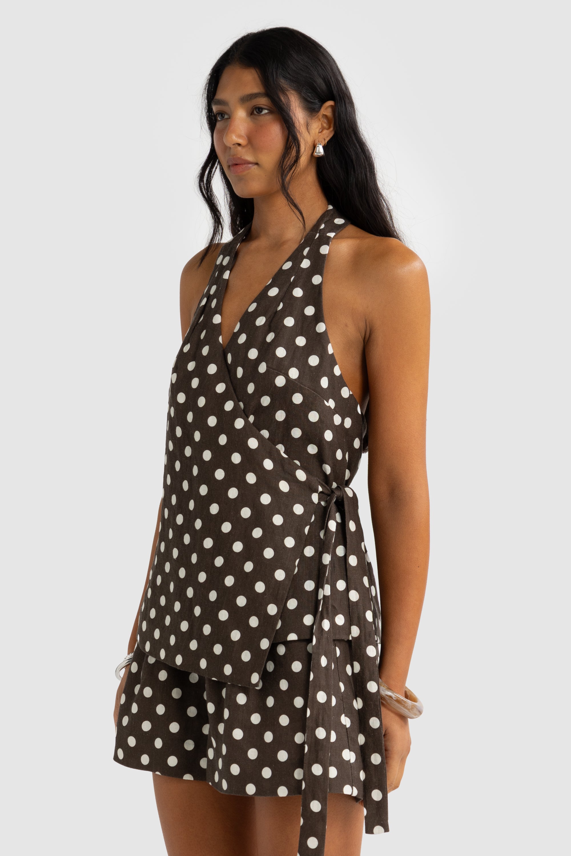 Elise Linen Wrap Top Carob Polkadot