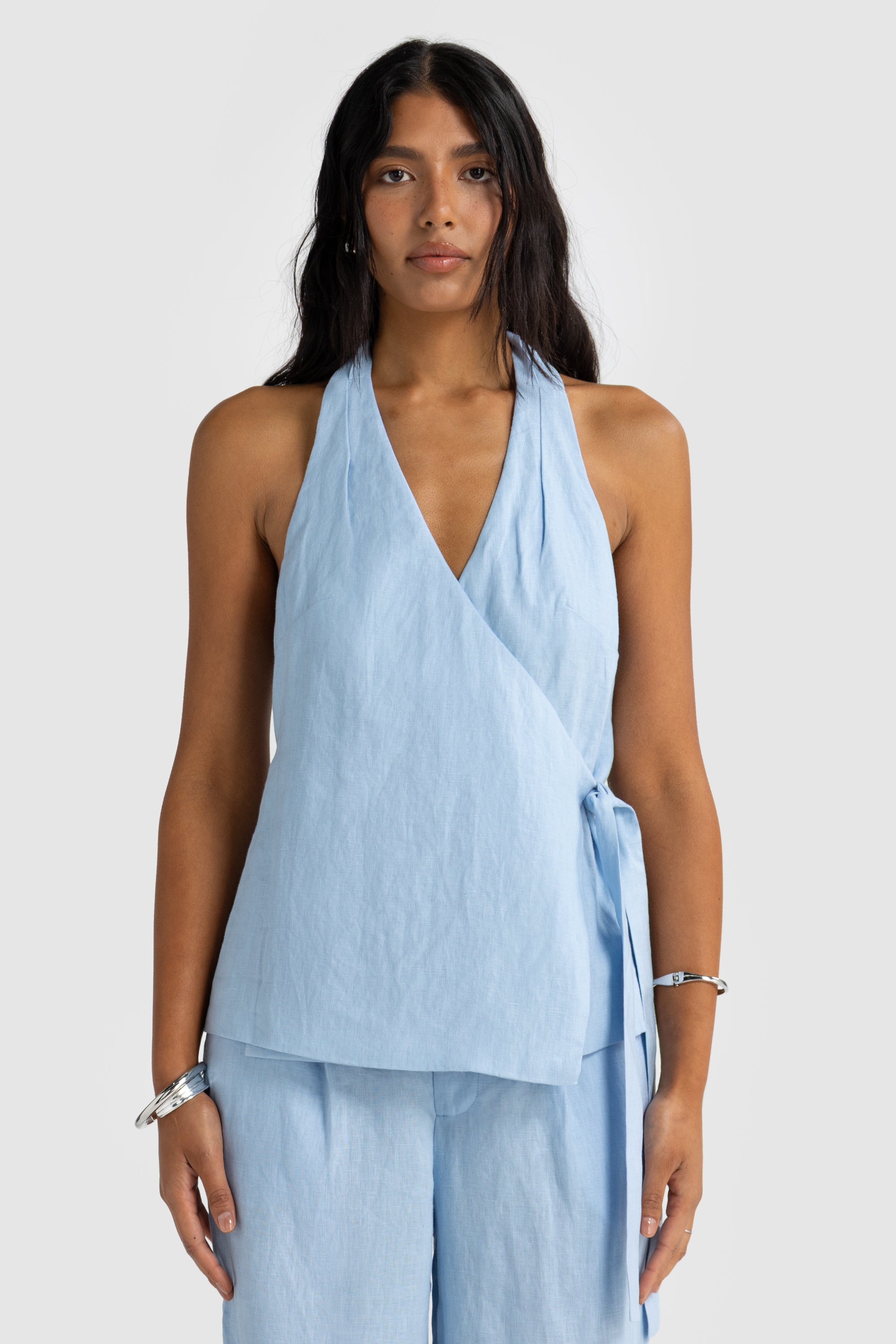 Chic and effortlessly feminine, the Elise Linen Wrap Top is crafted from breathable mid-weight linen. Featuring a halter neckline, plunging front, and open back, it ties at the waist with a matching wrap belt for a flattering fit.