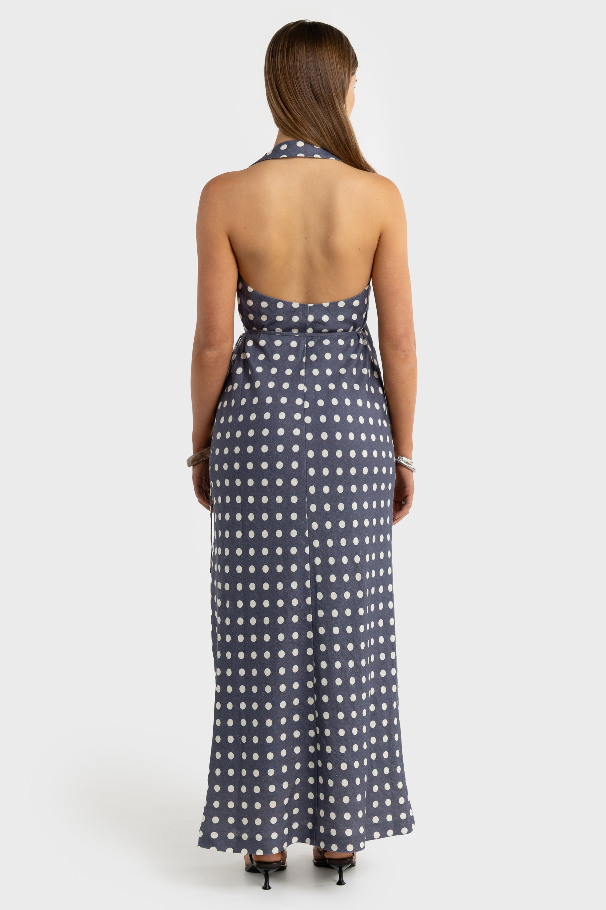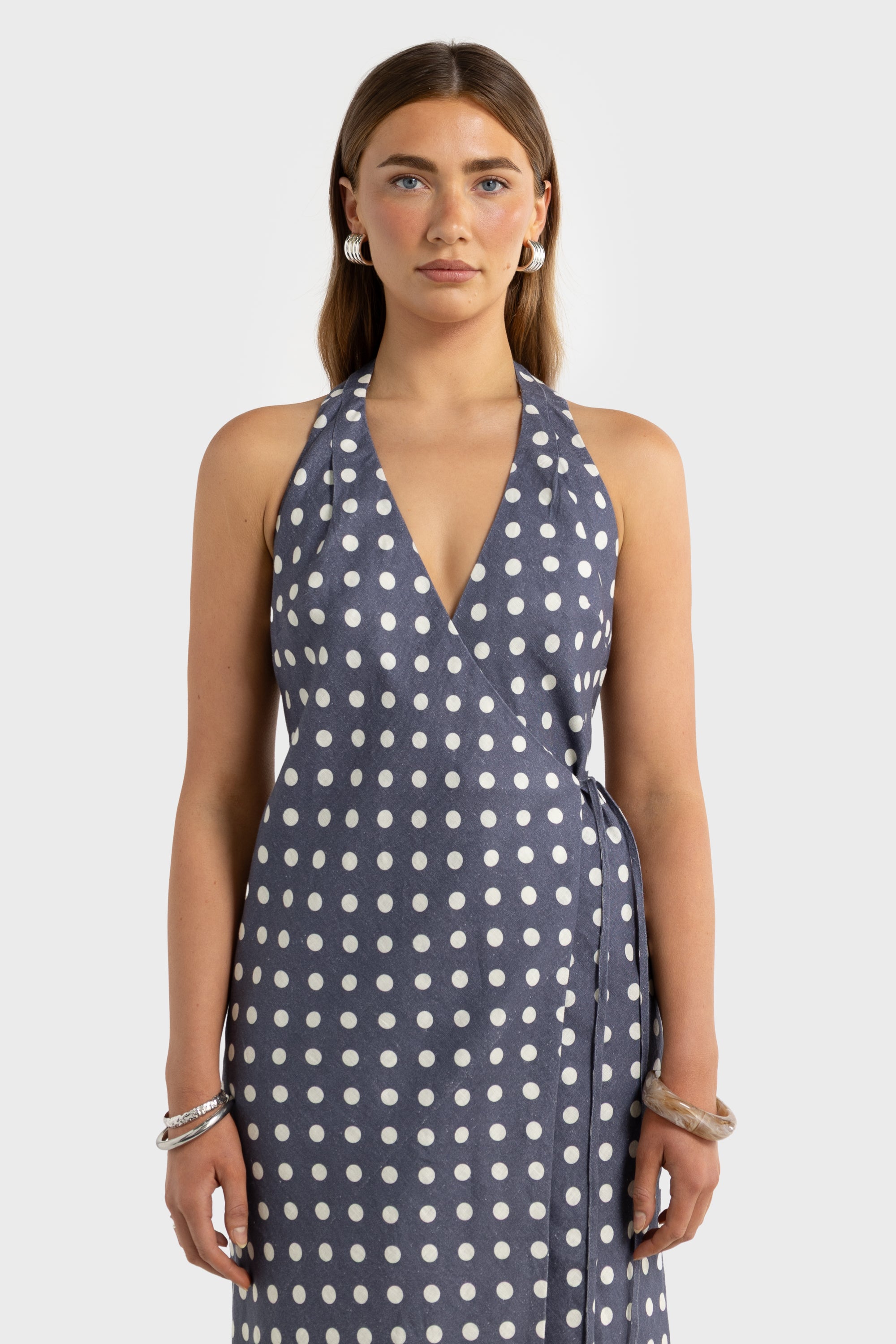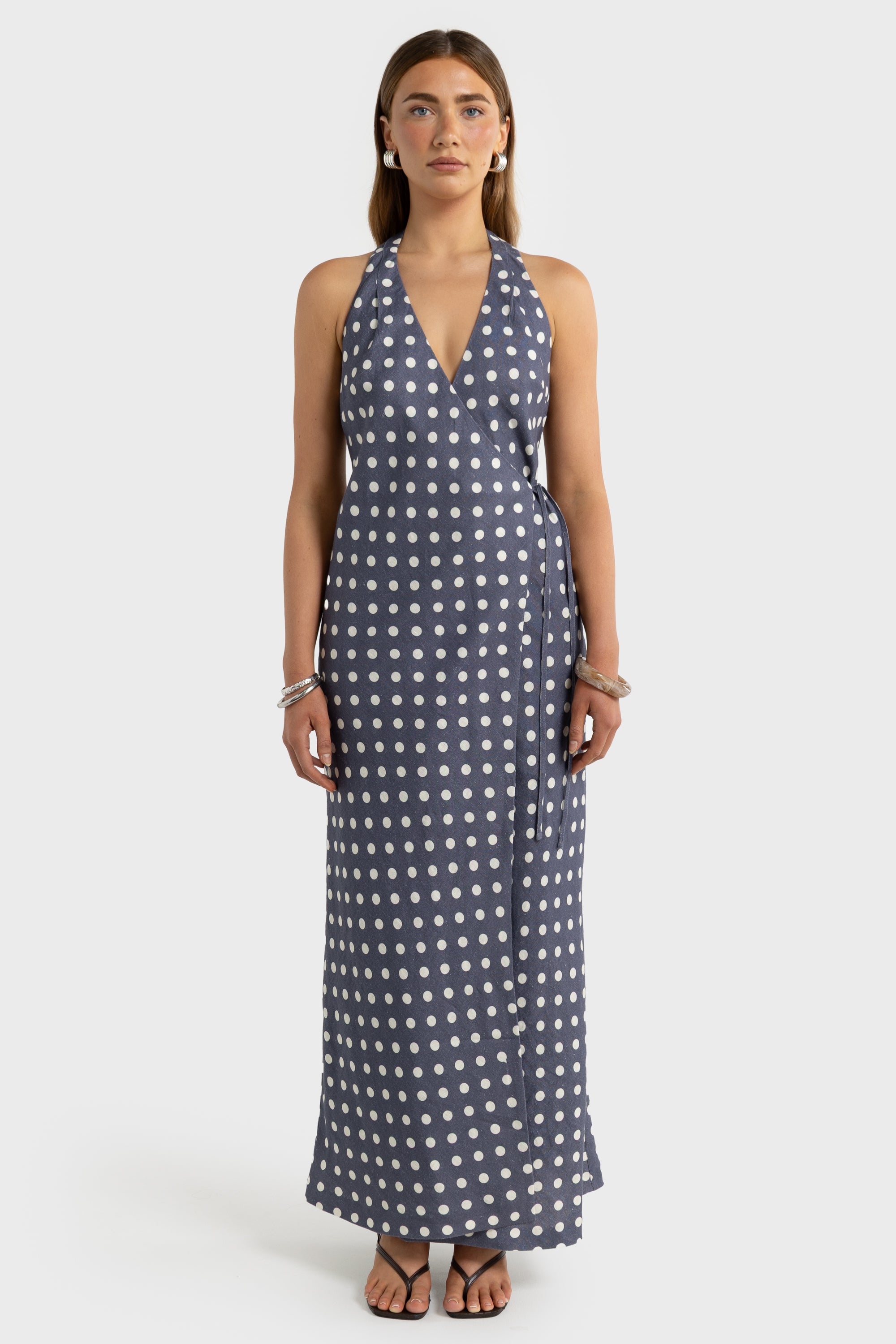 Elise Linen Wrap Full Length Dress Harbour Blue Polkadot